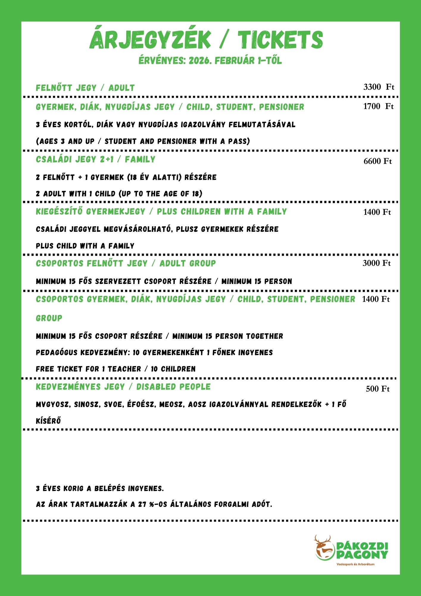 Nyitvatartás: január, február: 9.00-16.00, március: 9.00-17.00, április, május: 9.00-18.00, június, július, augusztus: 9.00-19.00, december 15-től január 1-ig ZÁRVA! szeptember, október: 9.00-18.00, november, december: 9.00-16.00